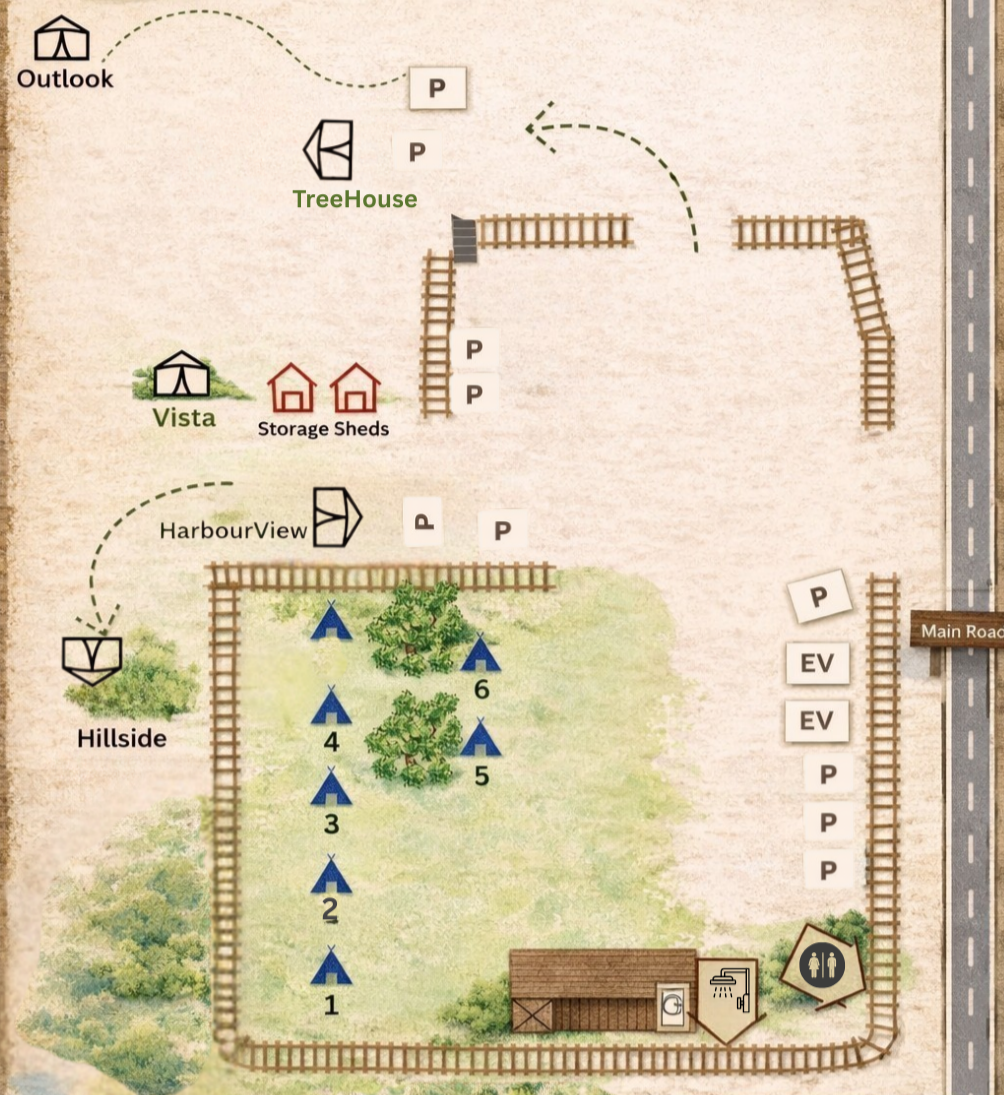 🟡 Sloped access; may not be suitable for small children or those with mobility concerns.Outlook Wall Tent (Private, Ocean View)
